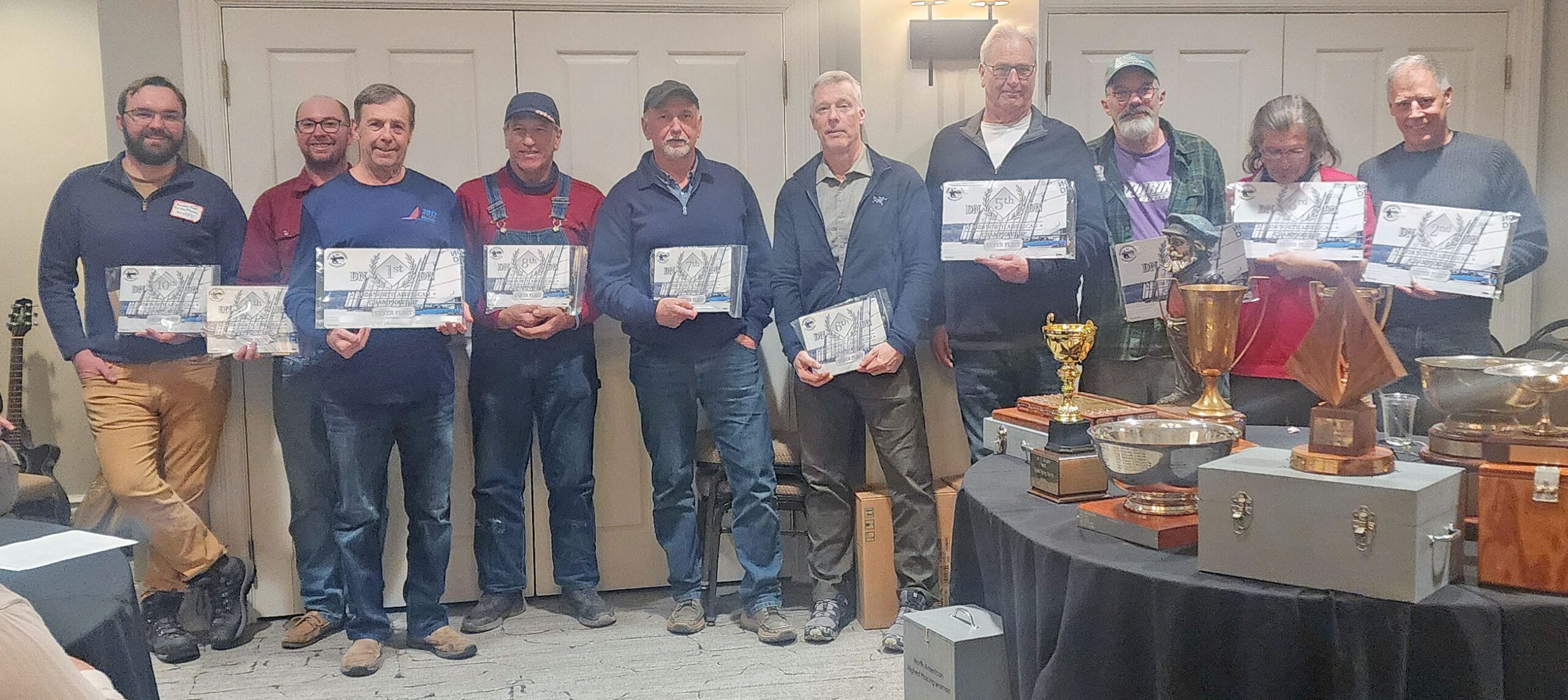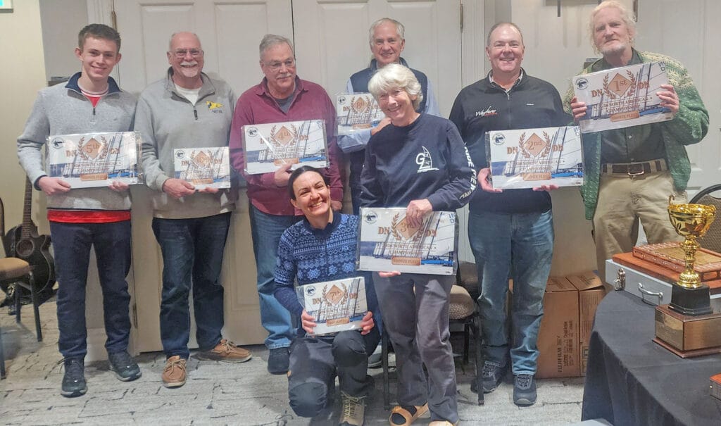 One especially meaningful presentation was the JR Francis Memorial Trophy, awarded to the winner of the first race of the North American Championship. The Francis family recently deeded the trophy to the DN class in JR’s honor. The bowl was made by JR himself while he was still in high school, making it a deeply personal piece of DN history.
