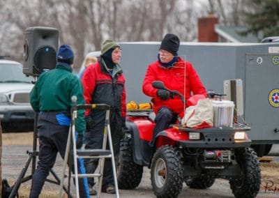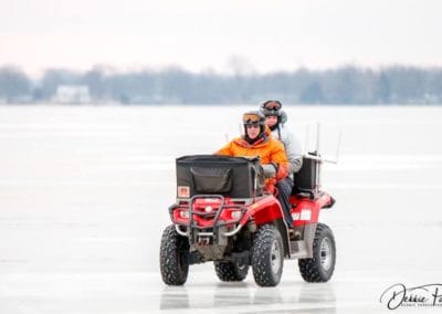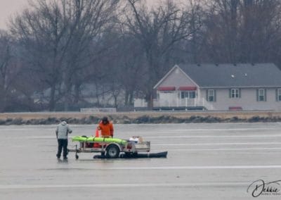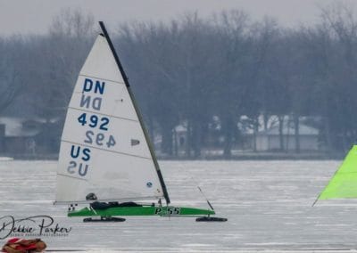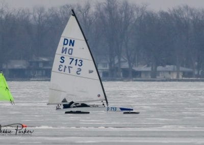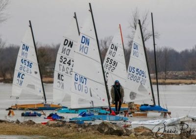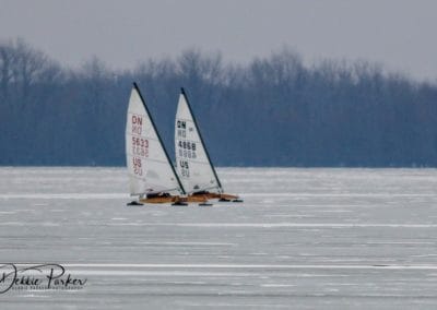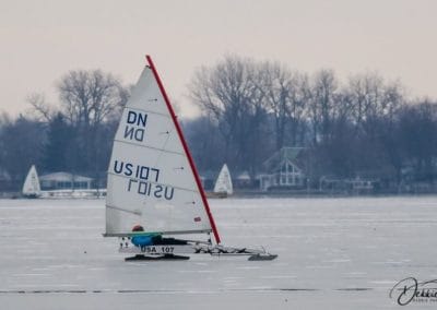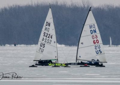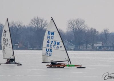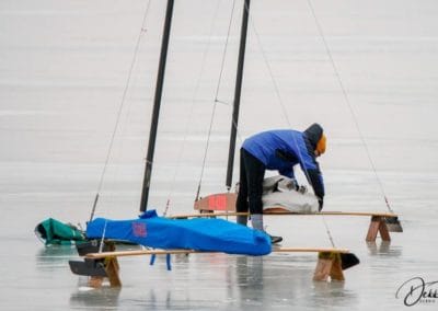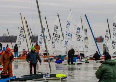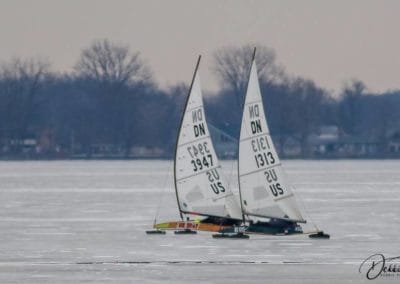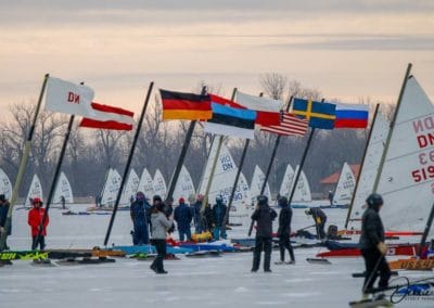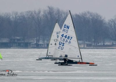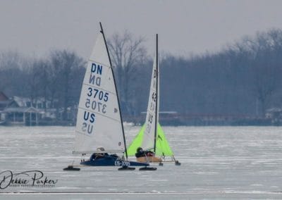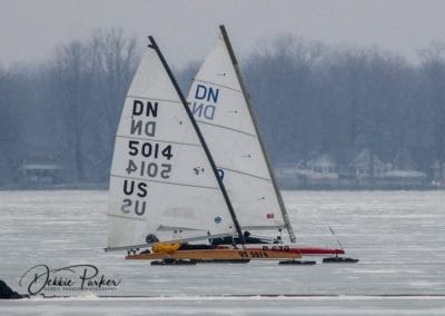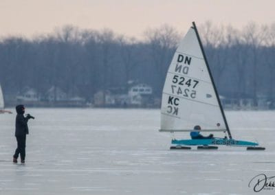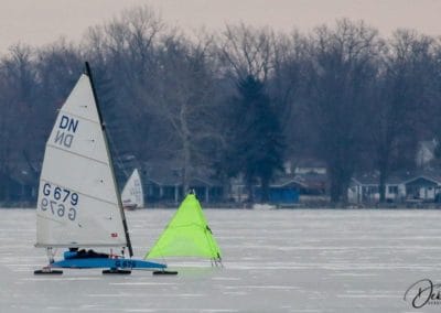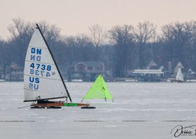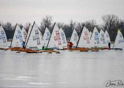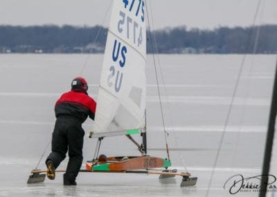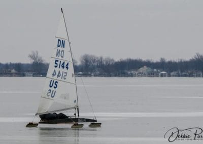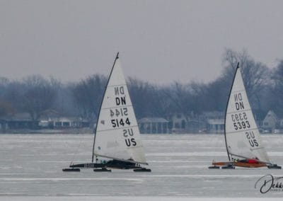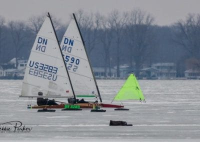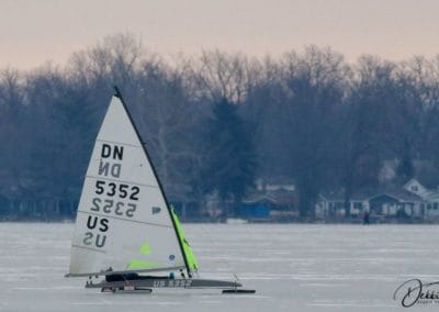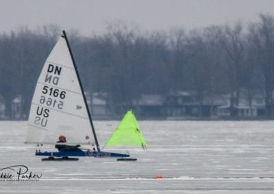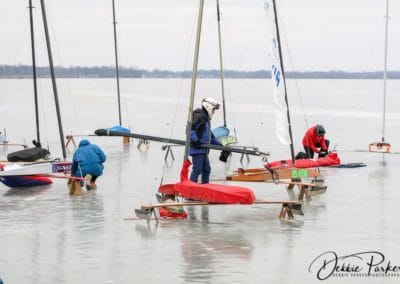 Good morning from Lima, Ohio Regatta HQ. There were two races in each fleet on day 1 of the Gold Cup. Ice is slippery to walk on, hard, and fast. Races were postponed a short while during the day as some visibility-limiting fleet moved through but then resumed. We’ll all be making the 30 minute drive to Indian Lake for day 2.