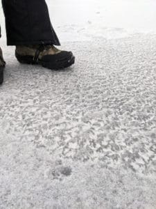 nuary 23, 2021: No wind today so we ran and pushed for miles. A working seam cuts the lake in about half. We went left out of the launch. 2 took one shore line, 2 took the other. Tons of room to sail. Small areas of stiff snow but not hard to push thru and separated by almost a mile for the most part. Surface is about 1/2 – 3/4 very textured snow ice that is very easy to cut through to a pretty decent hard surface. Barely a dusting of snow. Easily raced in 6+ mph wind. Overall I’d rate it a 6 (or a Maumee Bay 9).
