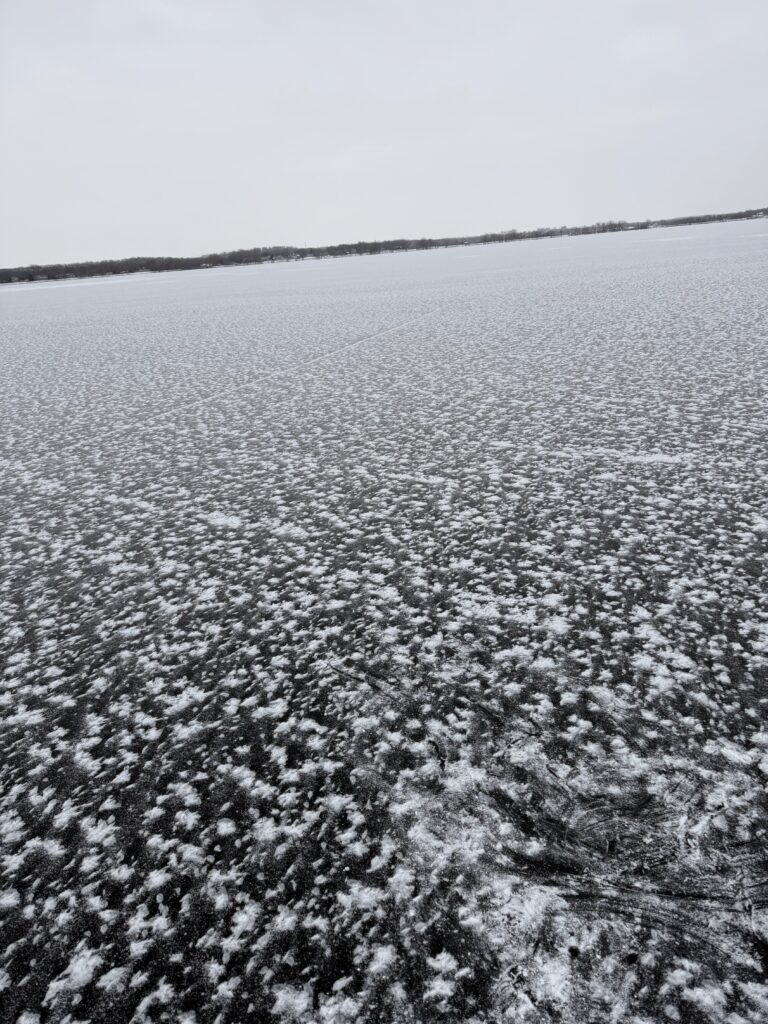 By Sunday morning, the snow had arrived, and it was clear that sailing at Wawasee was no longer viable. Pat did his due diligence, taking the ATV out on the lake to scout conditions and make his report. Unfortunately, what he found did not compare favorably to what was developing at Green Lake.
