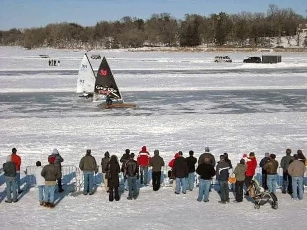 Iceboaters have always considered plowing a track to race when snow prevented sailing. The Icemaker took that vision to the next level and founded the World Ice Racing Circuit. He enlisted a few sponsors and got enough funds to plow two tracks on Lake Phalen in St Paul, MN. Mark envisioned four abreast NASCAR-style racing with TV coverage. He even convinced the Paul Winter Carnival to make it an official carnival event with boats in the parade and a sideshow of a petting zoo!